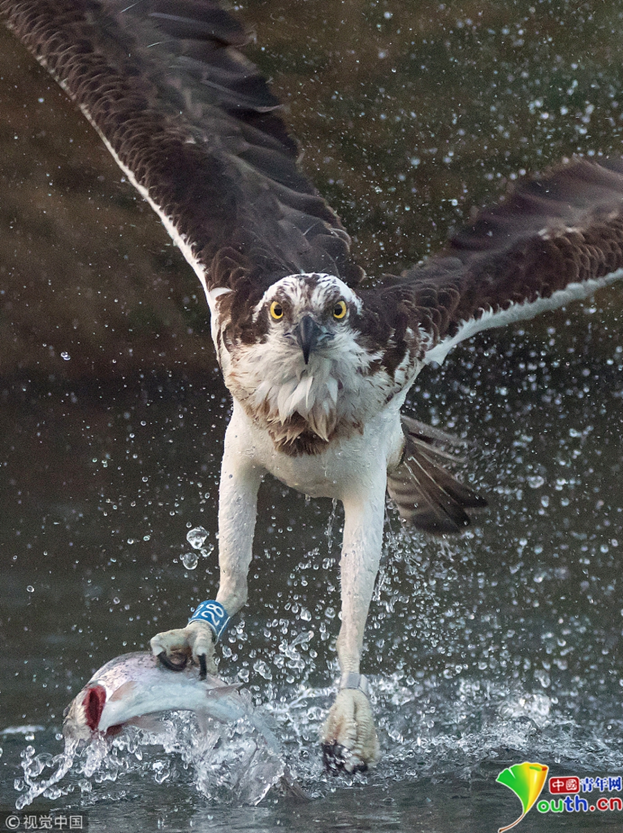 一只魚鷹潛入湖中捉鱒魚,激起巨大的水花。圖片作者/視覺中國