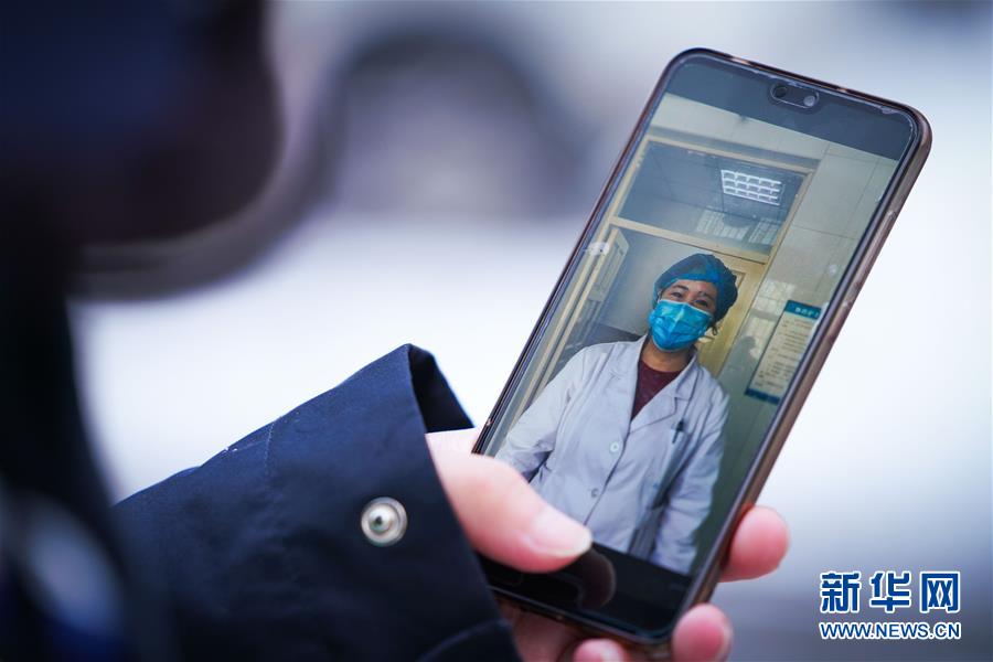 李可心展示手機(jī)里母親王晶的工作照(3月1日攝)。母親王晶是一名醫(yī)生,疫情期間在留觀病房工作。  新華社記者王松攝