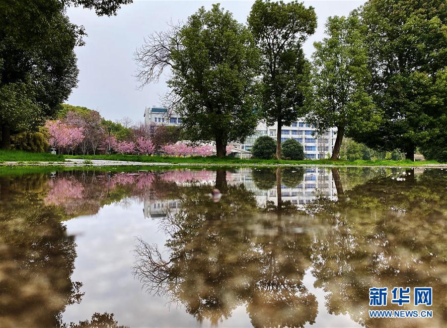 近日,隨著氣溫上升,武漢大學(xué)圖書館附近一片櫻花開放。 新華社記者 費(fèi)茂華 攝