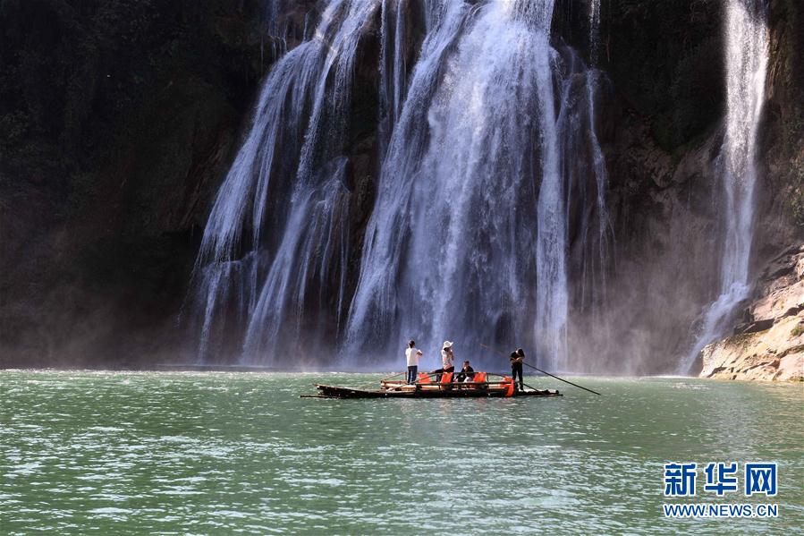 3月8日,游人在云南省曲靖市羅平九龍瀑布群風(fēng)景區(qū)乘竹筏游覽。