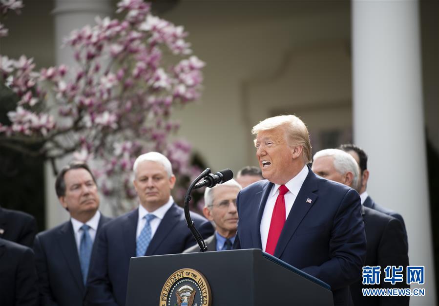 3月13日,美國(guó)總統(tǒng)特朗普(前)在華盛頓白宮的記者會(huì)上講話。特朗普當(dāng)天下午在白宮發(fā)表講話時(shí)正式宣布“國(guó)家緊急狀態(tài)”。他說(shuō),此舉旨在讓美國(guó)聯(lián)邦政府全力投入到抗擊新冠肺炎疫情的努力中。這項(xiàng)舉措將釋放500億美元資金,幫助各州和地方政府應(yīng)對(duì)疫情。新華社記者劉杰攝