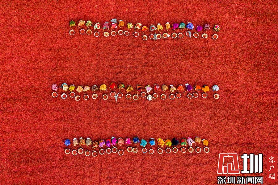 孟加拉國伯格拉,航拍穿著五顏六色衣服的工人們排列整齊的分揀辣椒。