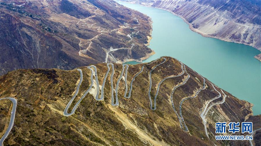 搬家的車隊在開道警車的引領(lǐng)下從云南省永善縣大興鎮(zhèn)開往魯?shù)榭h卯家灣易地扶貧安置區(qū)(3月15日攝,無人機照片)。 新華社記者 江文耀 攝