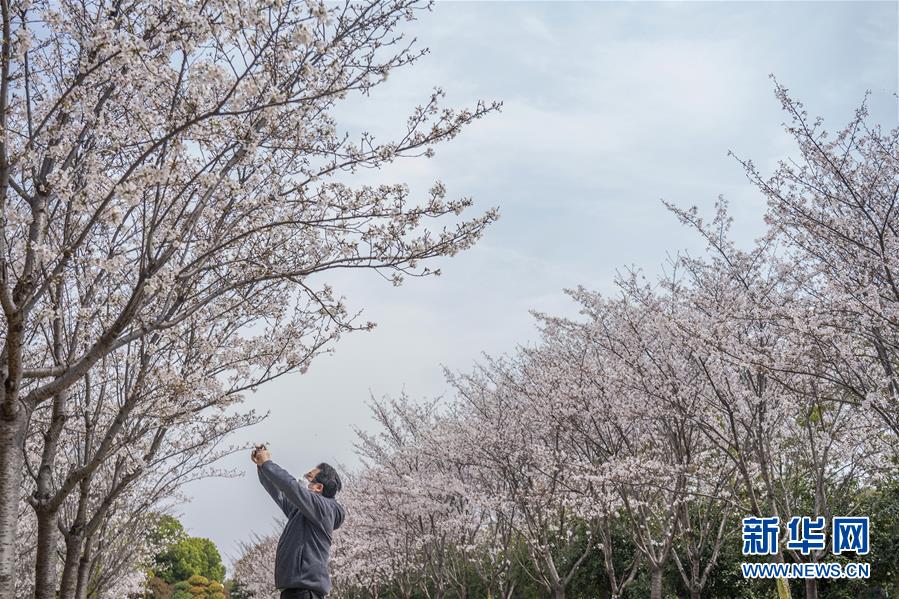 3月19日,在武漢市武昌區(qū)被網(wǎng)友稱為“武漢最美停車場”的湖北日報(bào)停車場,一名工作人員在拍攝櫻花。  新華社記者 才揚(yáng) 攝