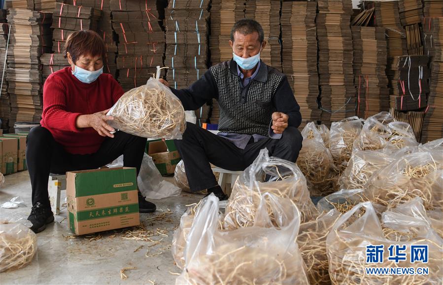 湖北當(dāng)陽市壩陵辦事處群華村村民宋發(fā)林(右)和妻子在農(nóng)產(chǎn)品合作社包裝產(chǎn)品,準(zhǔn)備通過電商外銷(3月21日攝)。近日,湖北當(dāng)陽市農(nóng)業(yè)生產(chǎn)和農(nóng)產(chǎn)品加工加速恢復(fù)。截至3月19日,當(dāng)陽市86家規(guī)上農(nóng)產(chǎn)品加工企業(yè)復(fù)工復(fù)產(chǎn)率為84.9%,51家農(nóng)業(yè)產(chǎn)業(yè)化重點龍頭企業(yè)有48家復(fù)工復(fù)產(chǎn),占比達(dá)94.1%。新華社記者程敏攝
