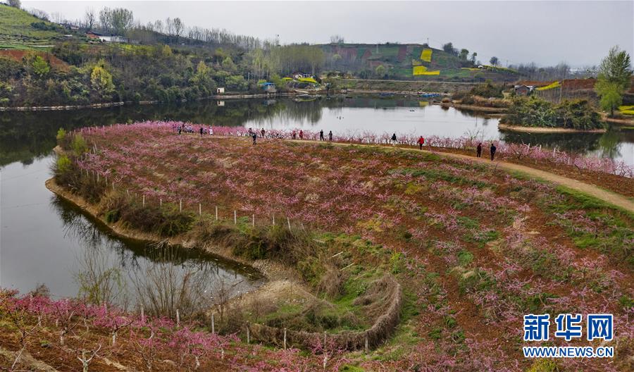 3月22日,游人在柳山湖的桃花島上游覽(無(wú)人機(jī)照片)。陽(yáng)春三月,陜西省漢中市洋縣龍亭鎮(zhèn)柳山村,1300畝桃園的花朵綻放。新華社記者陶明攝