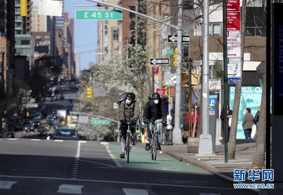 3月21日,在美國(guó)紐約第二大道,人們戴口罩騎車(chē)出行。美國(guó)紐約州、伊利諾伊州、康涅狄格州20日發(fā)布針對(duì)本州居民的“居家令”,以遏制新冠病毒傳播。這些“居家令”涵蓋紐約、洛杉磯、芝加哥等大城市,影響數(shù)千萬(wàn)人。白宮20日發(fā)表聲明說(shuō),總統(tǒng)特朗普已宣布紐約州出現(xiàn)“重大災(zāi)難”,命令聯(lián)邦政府支援該州抗擊新冠肺炎疫情。新華社記者王迎攝