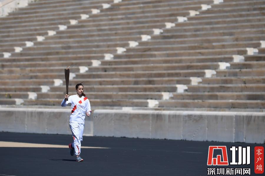 3月19日,最后一名火炬手里約奧運會女子撐桿跳高冠軍、希臘運動員卡特琳娜·斯特凡尼季手持圣火火炬跑向終點。