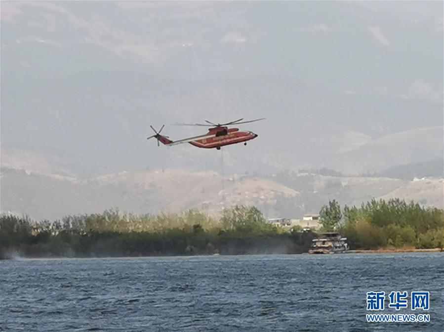 3月31日,在四川省西昌市,救火直升機從邛海取水。新華社記者惠小勇攝