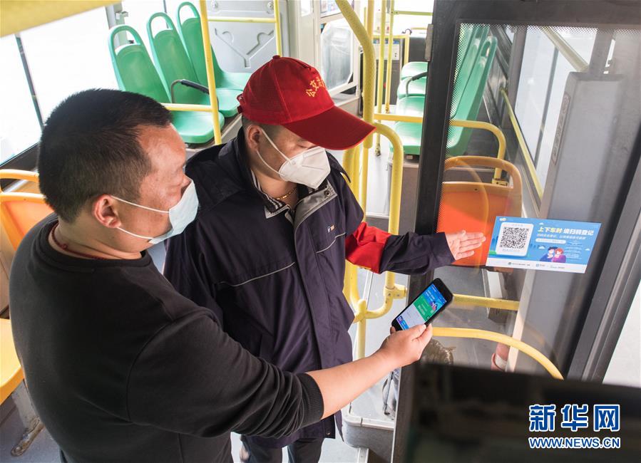 3月23日,在武昌火車(chē)站公交車(chē)總站,工作人員測(cè)試掃碼登記系統(tǒng)。新華社記者肖藝九攝