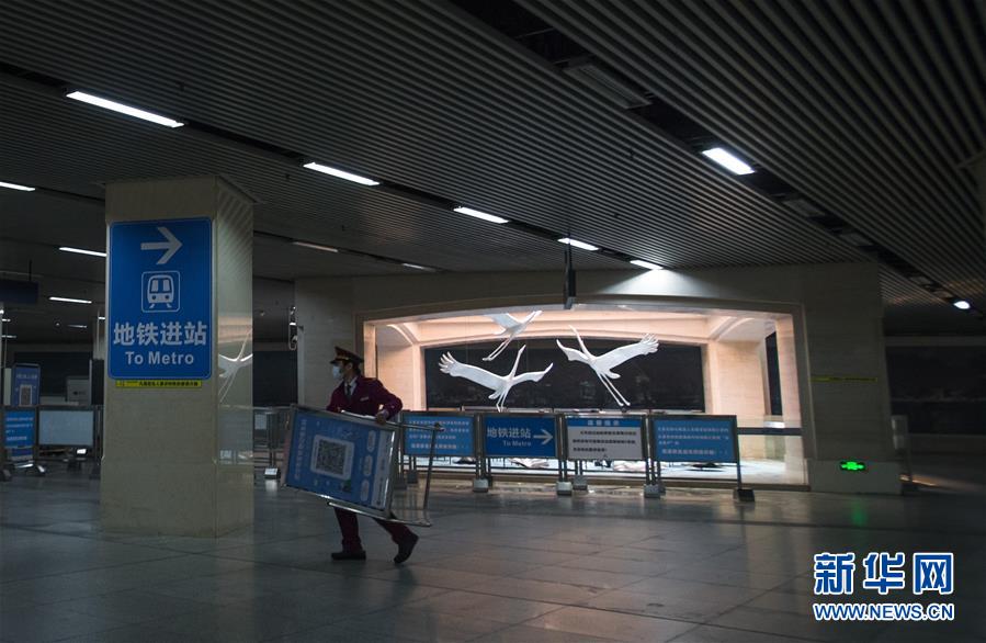 3月23日,在漢口火車(chē)站地鐵站,工作人員將進(jìn)站的二維碼牌搬運(yùn)至進(jìn)站口。新華社記者肖藝九攝