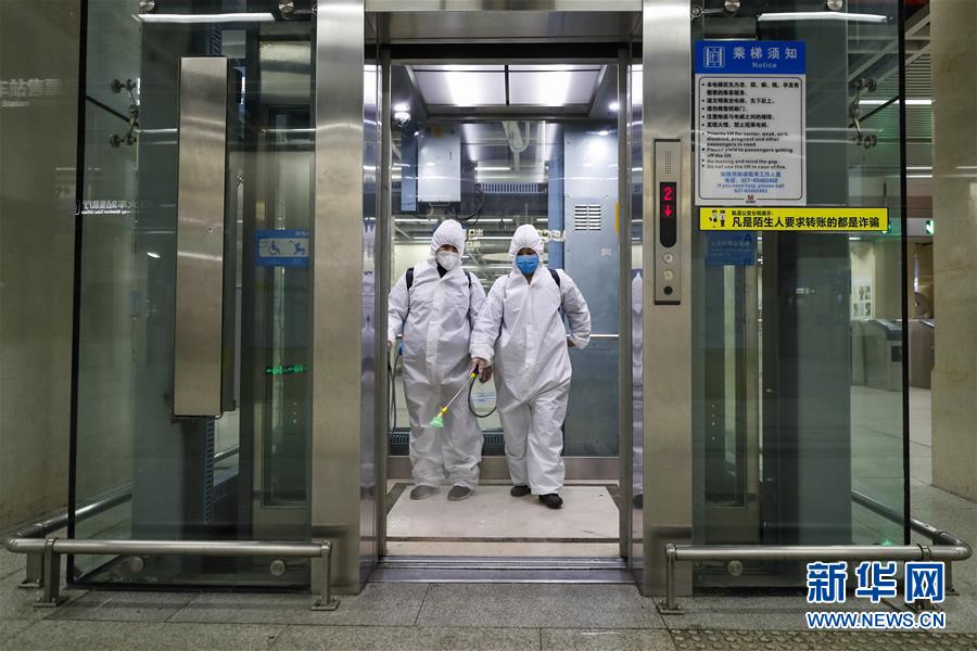 3月23日,在漢口火車(chē)站地鐵站,保潔人員在為站廳電梯消毒。新華社記者沈伯韓攝