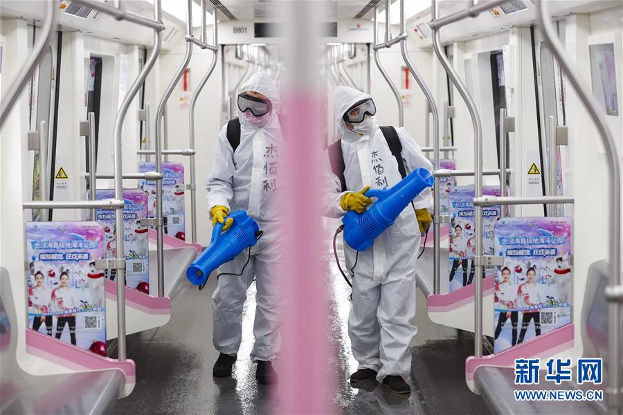 3月23日,在武漢地鐵常青車(chē)輛段,保潔人員在消毒。新華社記者肖藝九攝