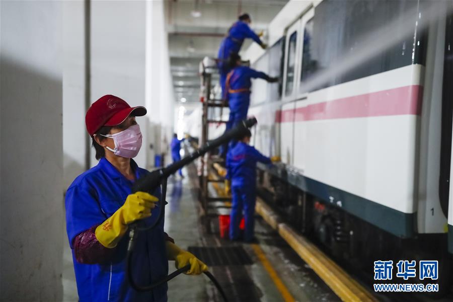 3月23日,在武漢地鐵常青車(chē)輛段,保潔人員清洗地鐵列車(chē)。新華社記者沈伯韓攝