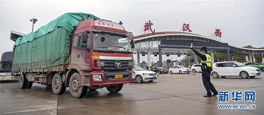 3月24日,在武漢西高速收費(fèi)站交通卡點(diǎn),執(zhí)勤民警準(zhǔn)備檢查車(chē)輛。新華社記者才揚(yáng)攝