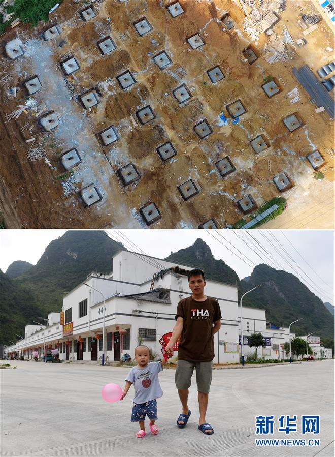 拼版照片:上圖為位于廣西都安瑤族自治縣大興鎮(zhèn)的正在施工建設的敢皓易地扶貧搬遷安置新區(qū)(2017年7月26日攝);下圖為居民在廣西都安瑤族自治縣大興鎮(zhèn)敢皓易地扶貧搬遷安置新區(qū)散步(2019年10月16日攝)。新華社記者陸波岸攝