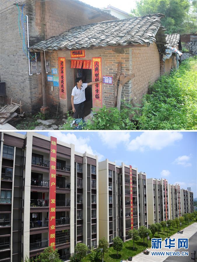 拼版照片:上圖為貧困戶楊金生站在位于廣西興業(yè)縣山心鎮(zhèn)蓬塘村的老宅門口(2018年8月24日攝,興業(yè)縣委宣傳部供圖);下圖為廣西興業(yè)縣易地扶貧搬遷安置小區(qū)“老鄉(xiāng)家園”內(nèi)的居民樓,貧困戶楊金生在這里有了自己的新房子(新華社記者曹祎銘2019年8月14日攝)。新華社發(fā)