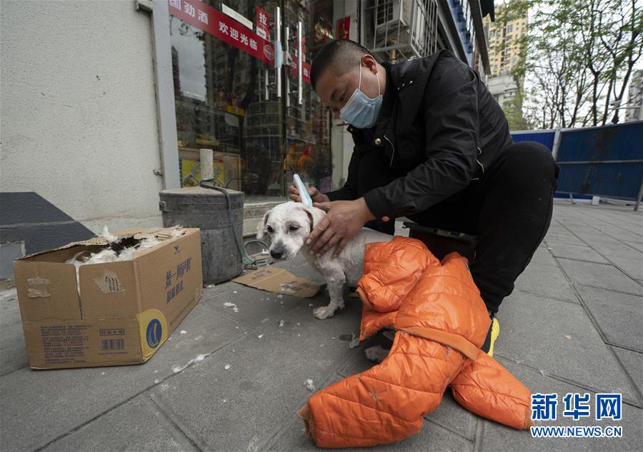 4月1日,一位市民在中山大道路邊給寵物剃毛,準備迎接夏天。新華社記者費茂華攝