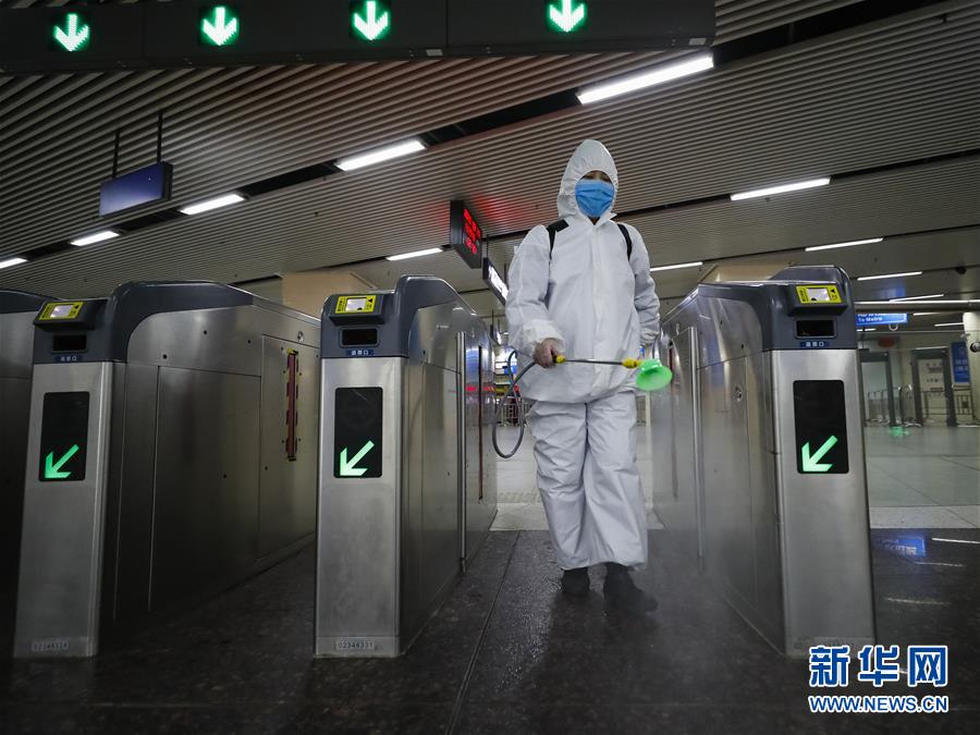 3月23日,在漢口火車站地鐵站,保潔人員在為站臺消毒。新華社記者沈伯韓攝