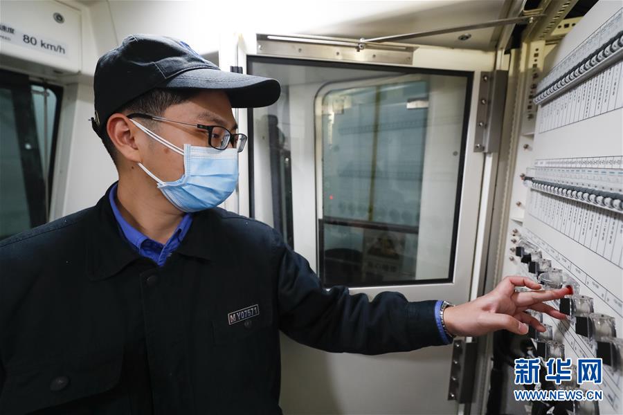3月23日,武漢地鐵運營有限公司車輛二部檢修一車間檢修員萬交林在地鐵列車上緩解所有制動,并檢查車輛制動相關(guān)功能。新華社記者沈伯韓攝