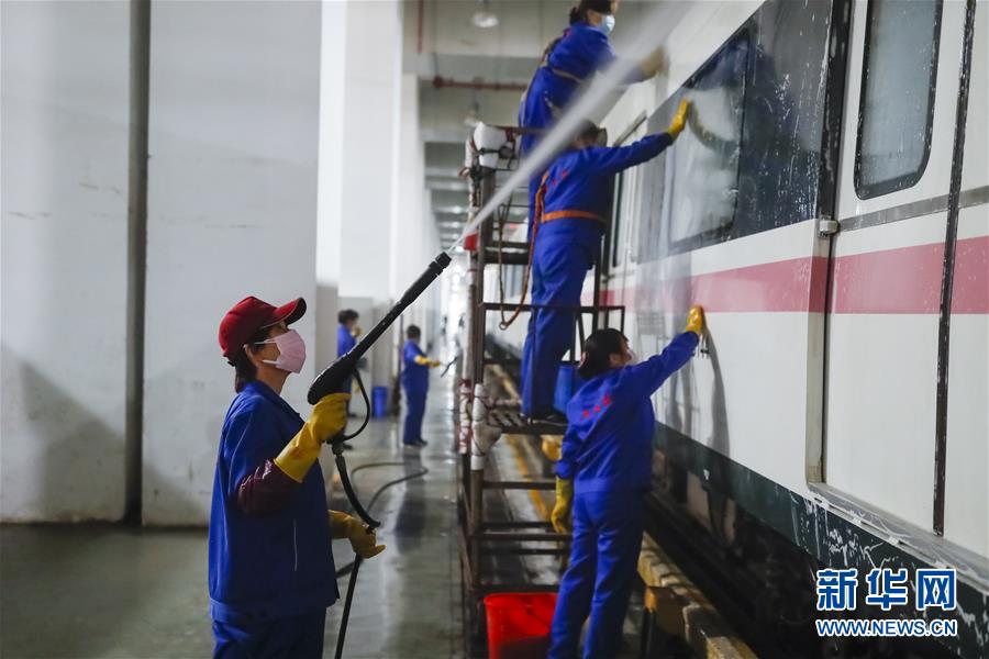 3月23日,在武漢地鐵常青車(chē)輛段,保潔人員清洗地鐵列車(chē)。新華社記者沈伯韓攝
