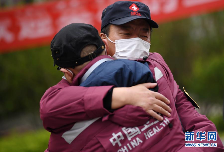 4月3日,陜西醫(yī)療隊隊員擁抱告別。 當日,陜西省第一批援鄂醫(yī)療隊137名隊員在陜西省工人療養(yǎng)院結(jié)束了為期兩周的隔離休養(yǎng)。醫(yī)療隊員與“戰(zhàn)友”深情作別后,陸續(xù)踏上歸途。 新華社記者 李一博 攝
