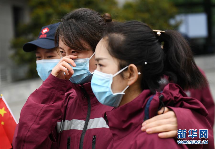 4月3日,來自陜西省榆林市第一醫(yī)院的醫(yī)療隊隊員王晶晶(中)在送別“戰(zhàn)友”后落淚。 當日,陜西省第一批援鄂醫(yī)療隊137名隊員在陜西省工人療養(yǎng)院結(jié)束了為期兩周的隔離休養(yǎng)。醫(yī)療隊員與“戰(zhàn)友”深情作別后,陸續(xù)踏上歸途。 新華社記者 李一博 攝