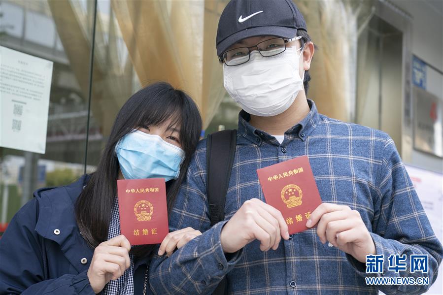 4月7日,在武漢市江岸區(qū)民政局婚姻登記處,新人盧先生和丁女士展示結(jié)婚證。 新華社記者才揚攝