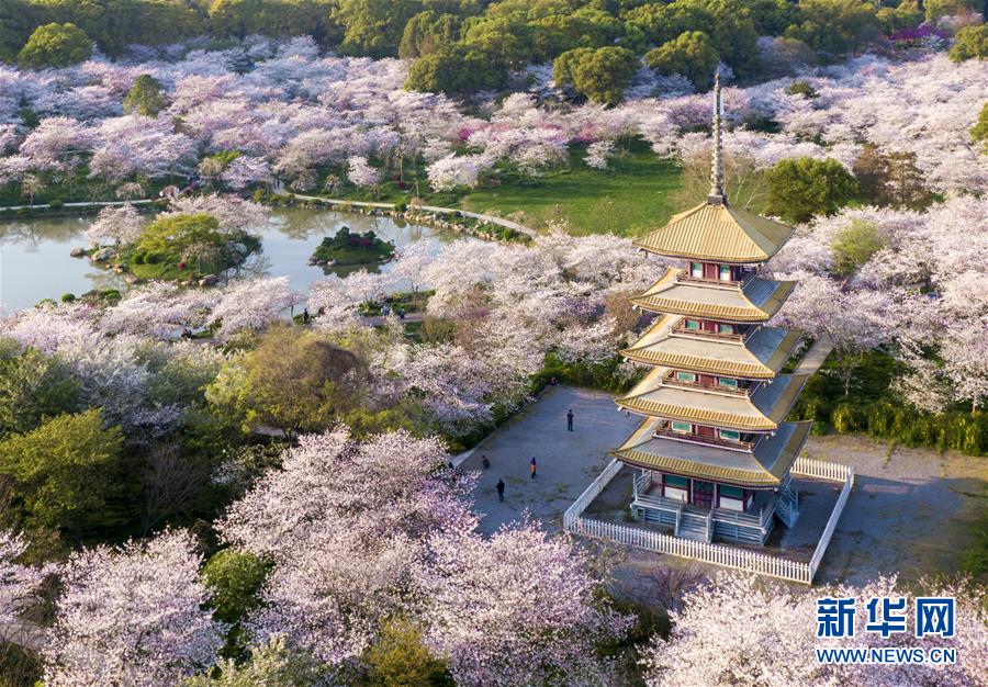 3月20日拍攝的武漢東湖櫻園(無人機照片)。 新華社記者 熊琦 攝