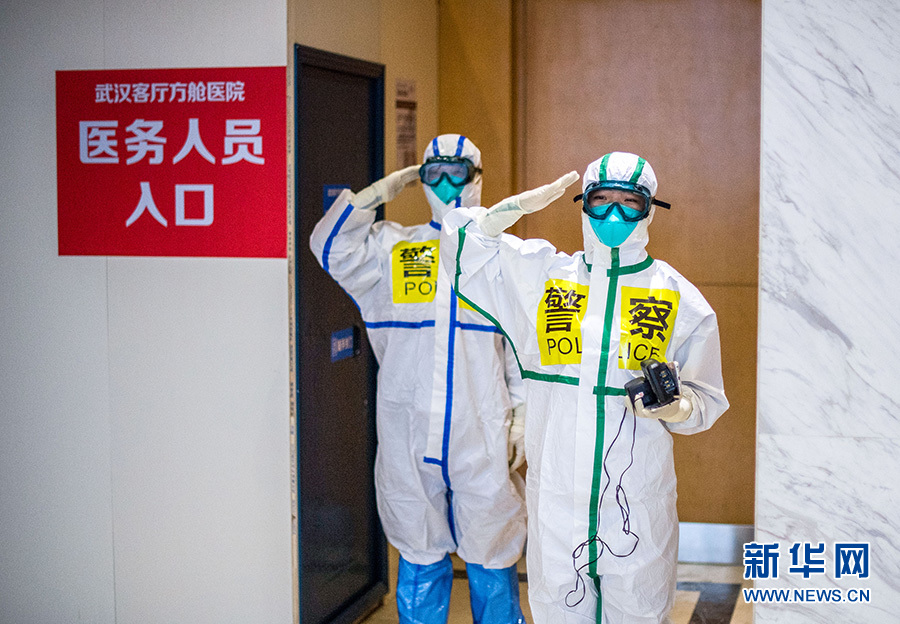 2月25日,在武漢客廳方艙醫(yī)院,來自武漢市東西湖區(qū)公安分局的民警張錦星(右)與同事劉晨在進方艙前向同事敬禮。 新華社記者 肖藝九 攝