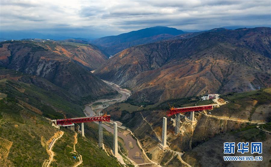 3月5日,空中俯瞰建設(shè)中的中老鐵路元江特大橋(無人機照片)。近期,中老鐵路玉溪至磨憨段有序復(fù)工復(fù)產(chǎn),由中鐵四局承建的中老鐵路全線重點控制性工程——元江特大橋、南溪河特大橋正在加緊施工建設(shè)。新華社記者江文耀攝