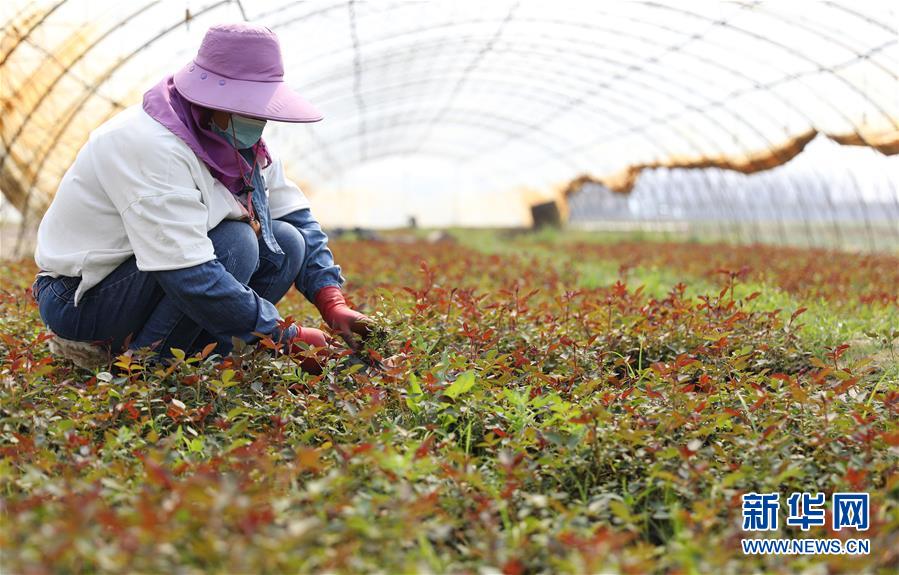 4月13日,在八角臺街道雅化村花圃內,花農為宿根花卉除草。新華社記者姚劍鋒攝
