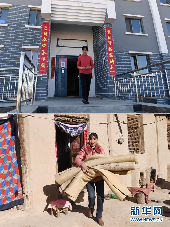 拼版照片:上圖為胥存在古浪縣綠洲生態(tài)移民小城鎮(zhèn)整理家中臥室(4月7日攝);下圖為胥存在古浪縣黃羊川鎮(zhèn)石城村收拾家中床上物品(2018年2月6日攝)。新華社記者范培珅攝