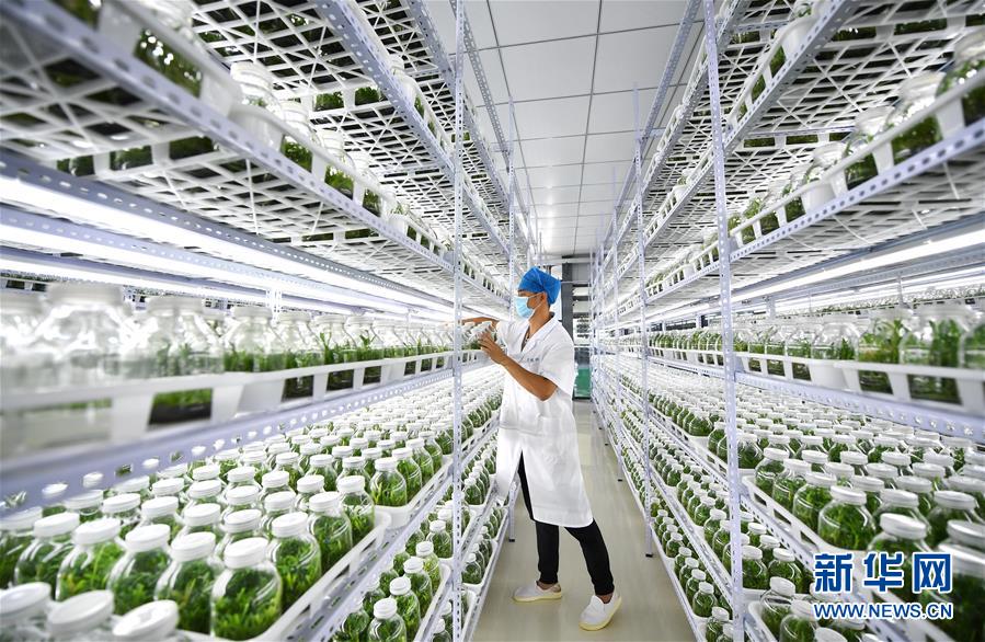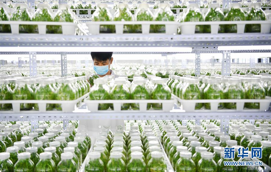 4月21日,在位于施茶村的海南勝嶸生物科技有限公司石斛育種培養(yǎng)室內(nèi),工作人員查看石斛種苗的生長情況。新華社記者郭程攝
