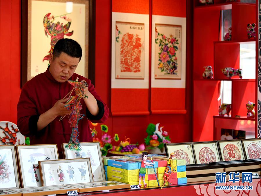 4月23日,在西安大唐不夜城步行街一家民俗產(chǎn)品商店,工作人員整理貨品。  新華社記者 張博文 攝