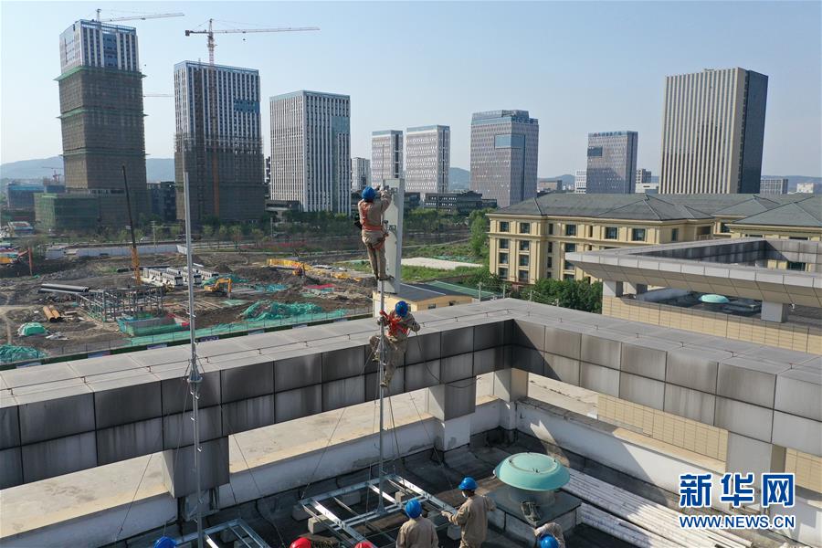 4月25日,在南京220千伏城南河變電站屋頂,工人在架設(shè)設(shè)備(無人機照片)。當(dāng)日,三大通信運營商的2座5G、3座4G基站建設(shè)工作在南京220千伏城南河變電站屋頂有序展開。在變電站內(nèi)建設(shè)基站可有效利用電網(wǎng)資源,縮短建設(shè)周期,節(jié)約建設(shè)成本。新華社記者季春鵬攝