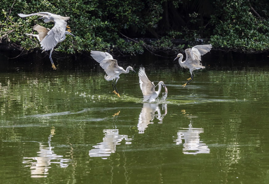 4月15日,攝于南山區(qū)華僑城天鵝堡附近。這是深圳拍鷺鳥(niǎo)的其中一個(gè)好去處。四只白鷺在水面上爭(zhēng)相捕食。徐捷