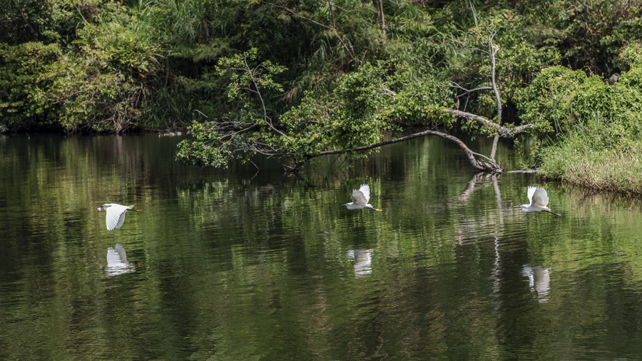 4月15日,攝于南山區(qū)華僑城天鵝堡附近。這是深圳拍鷺鳥的其中一個好去處。左一白鷺捕到食物,后方兩只白鷺追趕。徐捷