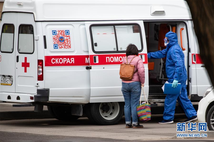 4月27日,在俄羅斯首都莫斯科,醫(yī)護人員(右)引導(dǎo)一名女子走上救護車。據(jù)俄羅斯防疫指揮部27日消息,過去24小時俄新增新冠肺炎確診病例6198例,累計確診87147例,單日增幅7.66%。新華社記者白雪騏攝