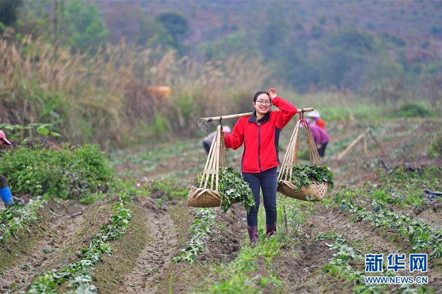 在廣西融水苗族自治縣永樂(lè)鎮(zhèn)紅薯種植基地,石秋香挑著紅薯苗,準(zhǔn)備種植(3月14日攝)。