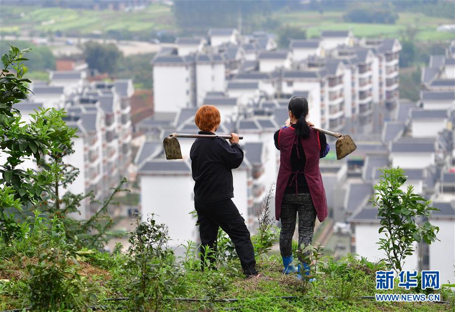 在廣西融水苗族自治縣縣城一處易地扶貧搬遷小區(qū)附近,45歲的楊美燕(左)和搬遷戶楊鮮花在農(nóng)場(chǎng)里護(hù)理果樹(3月13日攝)。