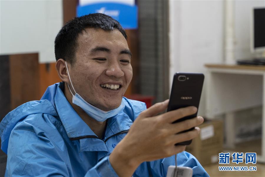 4月22日,在四川省成都市的一家外賣配送站點,邱有哈子在與家人視頻聊天。新華社記者 李夢馨 攝