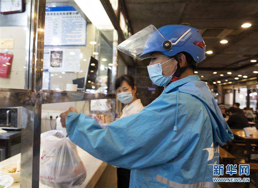 4月22日,在四川省成都市的一家餐廳,邱有哈子在取餐。 新華社記者 李夢馨 攝