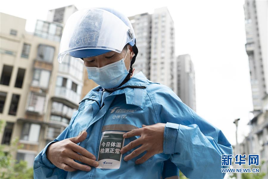 4月22日,在四川省成都市的一家外賣配送站點,邱有哈子接受體溫檢測后貼上合格標(biāo)簽。 新華社記者 李夢馨 攝