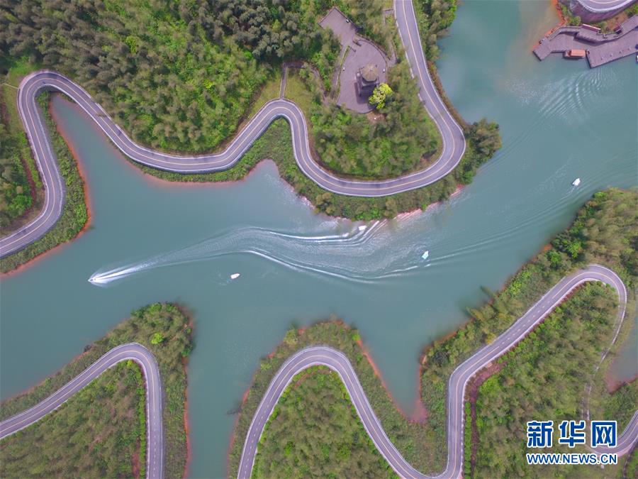 5月1日,在貴州省赤水市竹海國家森林公園里,游客乘坐快艇游覽竹海湖(無人機(jī)照片)?!拔逡弧奔偃掌陂g,人們以多種方式放松心情、享受假日。新華社發(fā)(張鵬攝)