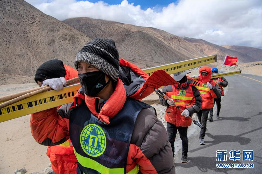 在西藏定日縣曲當(dāng)鄉(xiāng)境內(nèi),國測一大隊(duì)隊(duì)員前往水準(zhǔn)測量點(diǎn)(4月18日攝)。水準(zhǔn)測量是一種利用提供水平視線的儀器(如水準(zhǔn)儀、水準(zhǔn)標(biāo)尺),測定地面不同點(diǎn)之間的高差,并以此推算高度的一種方法,是經(jīng)典大地測量的重要技術(shù)之一。在目前正在進(jìn)行的2020珠峰高程測量中,部分國測一大隊(duì)隊(duì)員承擔(dān)了水準(zhǔn)測量的任務(wù)。新華社記者孫非攝