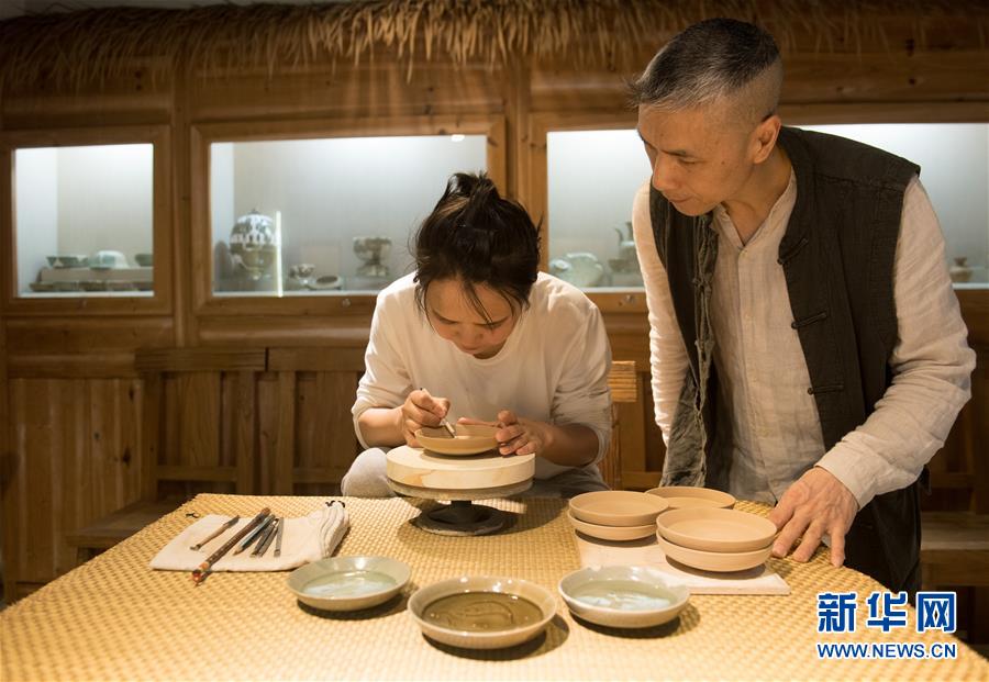 5月8日,“90后”瓷人湯佳(左)在龍泉青瓷裝飾紋樣研究所對著項(xiàng)宏金收藏的古瓷器刻劃魚紋盤。1965年出生的項(xiàng)宏金,被浙江龍泉年輕一代瓷人稱為“項(xiàng)哥”,他從20世紀(jì)90年代開始收集龍泉青瓷標(biāo)本,研究青瓷紋樣。2014年出版著作《龍泉青瓷裝飾紋樣》,次年開設(shè)龍泉青瓷裝飾紋樣研究所,將自己收藏的千余件標(biāo)本跟瓷器愛好者、創(chuàng)作者免費(fèi)分享。新華社記者翁忻旸攝