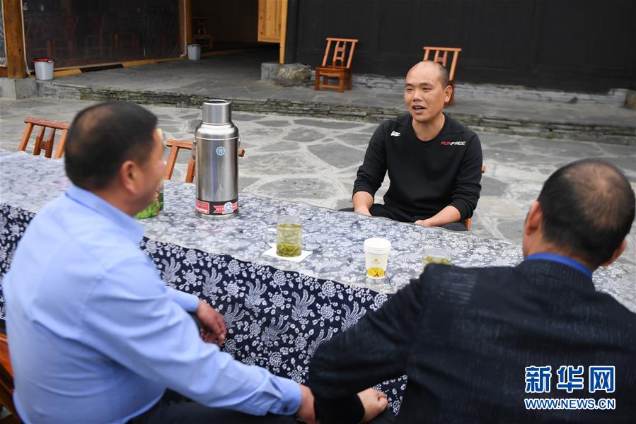 楊正邦(中)在和來(lái)自浙江的住客攀談(4月25日攝)。楊正邦1978年出生于十八洞村,在外打工多年。近些年,眼看來(lái)十八洞村的游客越來(lái)越多,村里越來(lái)越熱鬧,楊正邦在2017年結(jié)束自己的打工生涯回鄉(xiāng)發(fā)展。他先是在村里擺起小吃攤,2018年開起農(nóng)家樂(lè),去年又搭起新房子擴(kuò)建成民宿,年度家庭人均純收入從2014年的1923元增加到2019年的7173元。新華社記者薛宇舸攝