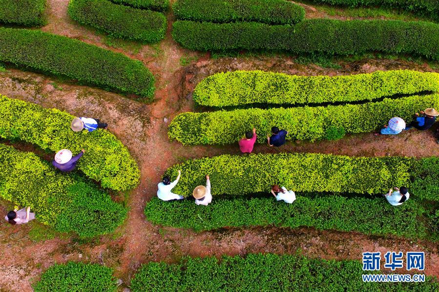 游玉瓊和方舟帶著公司員工抓緊采摘武夷巖茶中的白雞冠品種(無(wú)人機(jī)照片,5月10日攝)。新華社記者魏培全攝