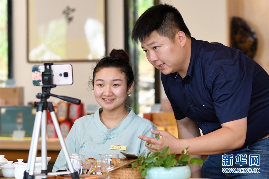 方舟(右)在指導公司員工使用電商平臺直播銷售武夷巖茶(5月10日攝)。新華社記者魏培全攝